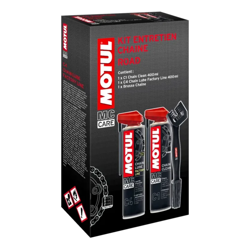 Je vous recommande les kits complets avec tout le nécessaire pour nettoyer et graisser votre chaîne et ils sont toujours vendus avec la brosse spéciale chaîne. Vous pourrez entretenir un kit chaîne à plusieurs reprises avec un seul kit