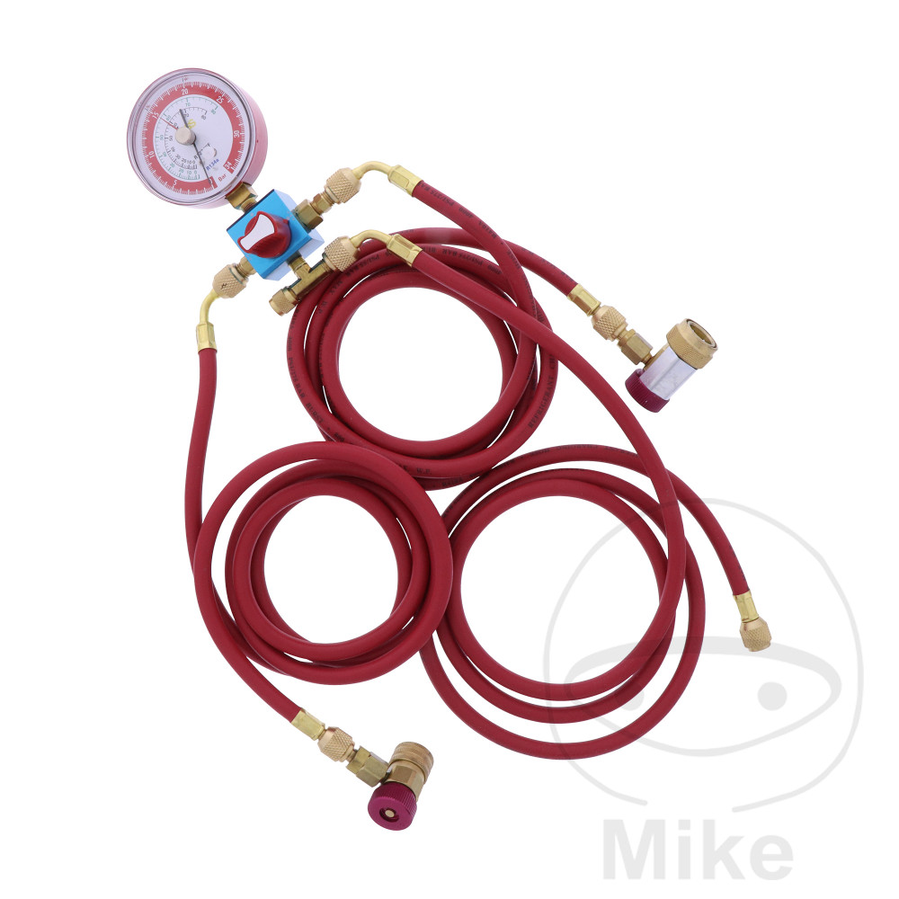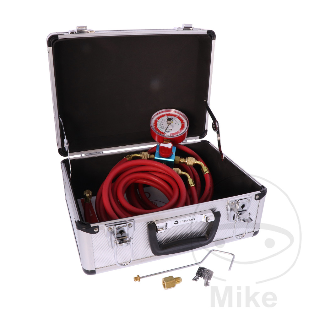 3 x 1,8 m de conduite haute pressionRaccord rapide haute pression R 134 a pour le raccordement à la climatisationRaccord rapide haute pression YF 1234 pour le raccordement à la climatisationVanne à 3 voies avec manomètre pour évaluer la chute de pressionMode d’emploiCoffret en aluminium