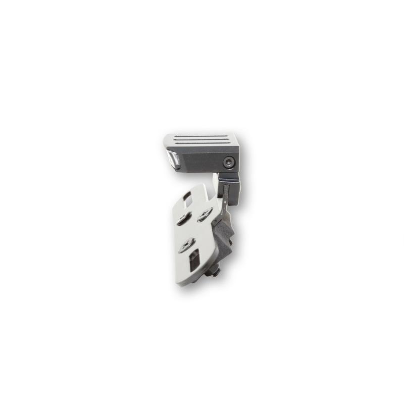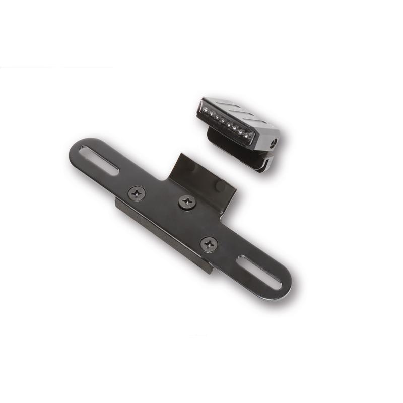 Combinaison universelle de feux arrière / feux stop à LED avec support de plaque d’immatriculation et éclairage de plaque d’immatriculation dans un boîtier en métal noir et verre teinté. Le feu arrière est amovible, homologué E.