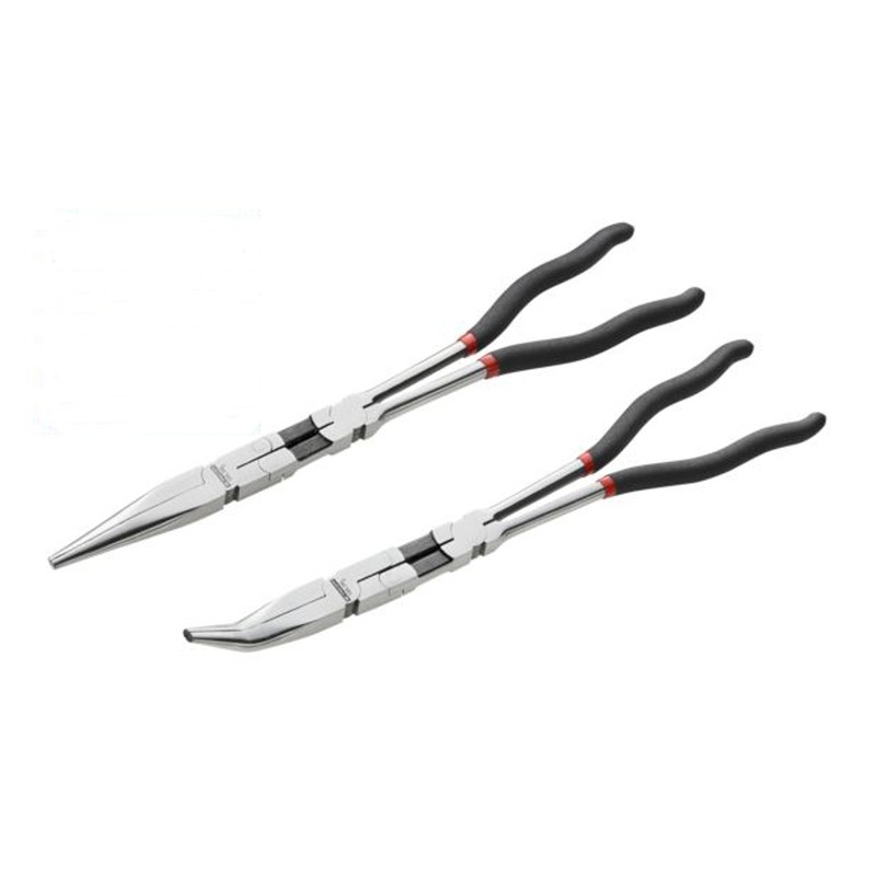 Jeu de 2 pinces à becs extra-longs idéales pour travailler dans les zones difficiles d’accès. Une pince à becs longs et fins et une pince à becs demi-ronds.