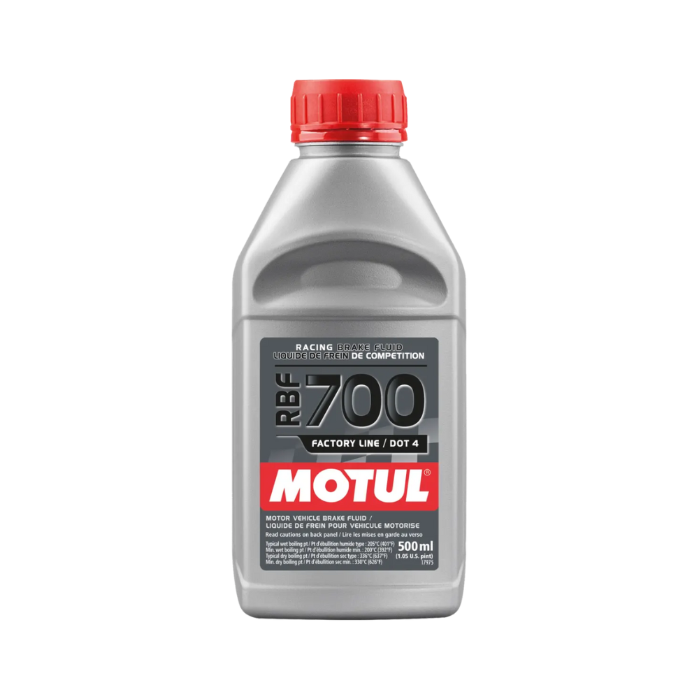 MOTUL (Racing Brake Fluid) RBF 700 est un liquide de frein synthétique haute performance développé pour offrir une consistance et une puissance de freinage maximale aux températures extrêmes générées par les freins carbone ou céramique en utilisation compétition et racing. En autorisant la réduction des entrées d’air de refroidissement des freins il permet l’amélioration de la trainée aérodynamique. Convient pour les freins conventionnels avec disques en acier. Convient pour les commandes hydrauliques d’embrayages. RBF 700 répond à la norme DOT 4 qui autorise l’utilisation du fluide dans des véhicules hautes performances en application routière.