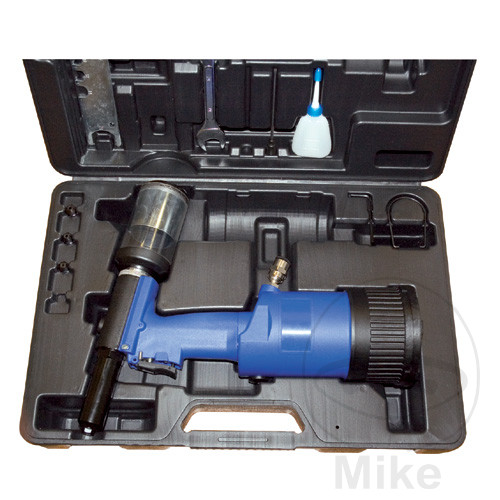 Pistolet à rivets aveugles en matériau composite pour rivets standard, en aluminium, en cuivre et en acier inoxydable, en coffret plastique, avec nez de 4,0-4,8-6,4 mm et outil universel pour le changement de mâchoires et de nez, extraction automatique des goupilles. Dans l’affaire.