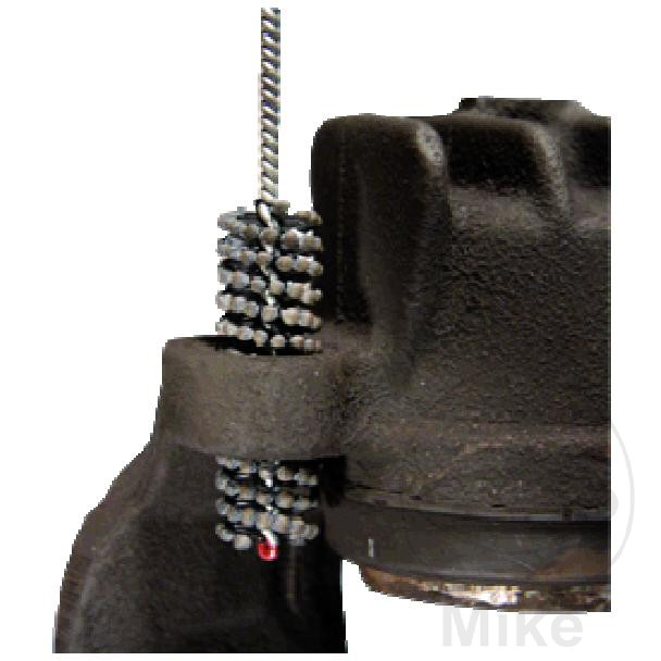 La brosse à roder est l’outil idéal pour nettoyer en profondeur les trous rouillés destinés à recevoir les douilles de guidage des étriers de frein (étriers de frein à main). L’alésage de réception dans le boîtier de l’étrier est souvent plus ou moins fortement corrodé. La douille de guidage est ainsi écrasée et les boulons de guidage s’y coincent. L’étrier de frein ne peut plus bouger librement, ce qui entraîne d’autres problèmes de freinage. Après le démontage des anciennes douilles de guidage, les trous de réception dans le boîtier de l’étrier de frein doivent être polis à l’aide d’une brosse de rodage. Pour ce faire, il est préférable d’utiliser une visseuse sans fil (réglage max. 500 tr/min.) et de ne tourner que dans le sens des aiguilles d’une montre (rotation à droite). La brosse de rodage est adaptée à l’utilisation de différents diamètres de logements de douilles de guidage. Après le nettoyage des trous dans le boîtier de la selle, ceux-ci sont enduits d’une fine couche de Plastilube. Cela permet d’éviter une nouvelle corrosion et de faciliter le montage des nouvelles douilles de guidage.
