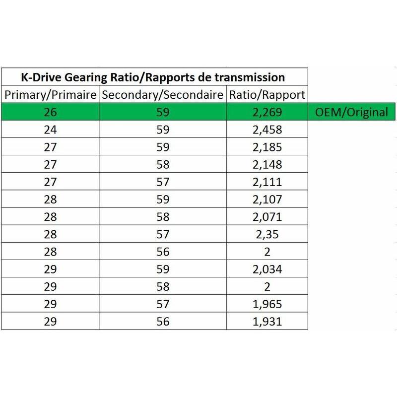 Les poulies primaires K-Drive sont réalisés en aluminium anodisé de 25 microns de profondeur, garantissant la résistance à l’usure. Ils sont disponibles en 24, 27, 28 et 29 dents.