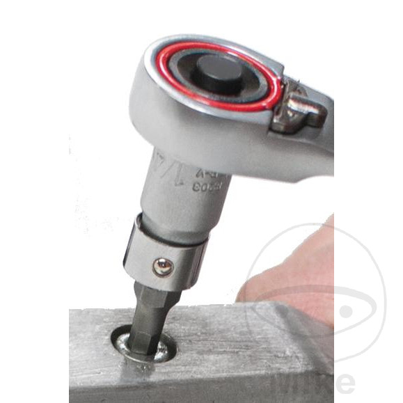 La clé à cliquet de type S est dotée d’un entraînement hexagonal pour embouts et d’un entraînement quadrangulaire pour douilles avec blocage de l’insert (tous deux 1/4″ / 6,3 mm), d’une denture fine (72 dents) et d’une inversion gauche / droite.
