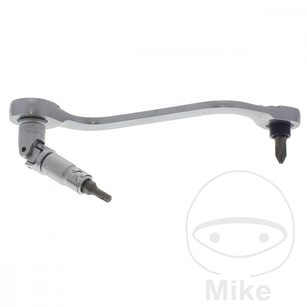 – La clé à cliquet de type S est dotée d’un entraînement hexagonal pour embouts et d’un entraînement quadrangulaire pour douilles avec blocage de l’insert (tous deux 1/4″ / 6,3 mm), d’une denture fine (72 dents) et d’une inversion gauche / droite.