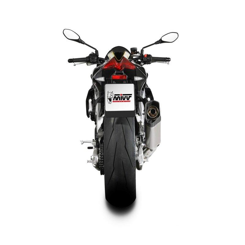 Cette version se caractérise par un corps en titane de forme hexagonale avec finition noir et la présence d’une coupelle en carbone avec un tissage T-will capable de résister aux contraintes de haute température typiques du monde des courses. Par rapport à l’échappement d’origine, le SR-1 en titane garantit une réduction significative du poids.