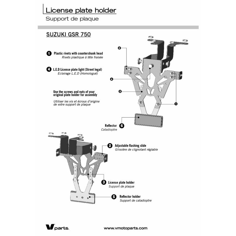- Permet la fixation de la plaque d’immatriculation, clignotants et éclairage de plaque.